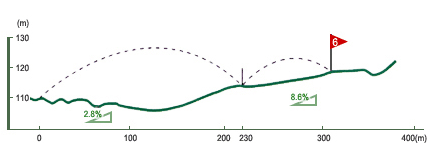 - 우측 Dog-Leg Hole로 Tee에서 Hole Pin이 보이지 않는 오르막으로 IP의 좌측에서 두 개의 Bunker와 우측에 카트도로 및 대형 Bunker가 있어 어렵게 느껴지는 감이 있으나, 좌측 뒷 Bunker를 보고 Driver shot을 날리면 IP가 넓어서 무난히 Two-On이 가능한 Hole이다. Green 공략은 Pin보다 짧은 것이 좋다.
