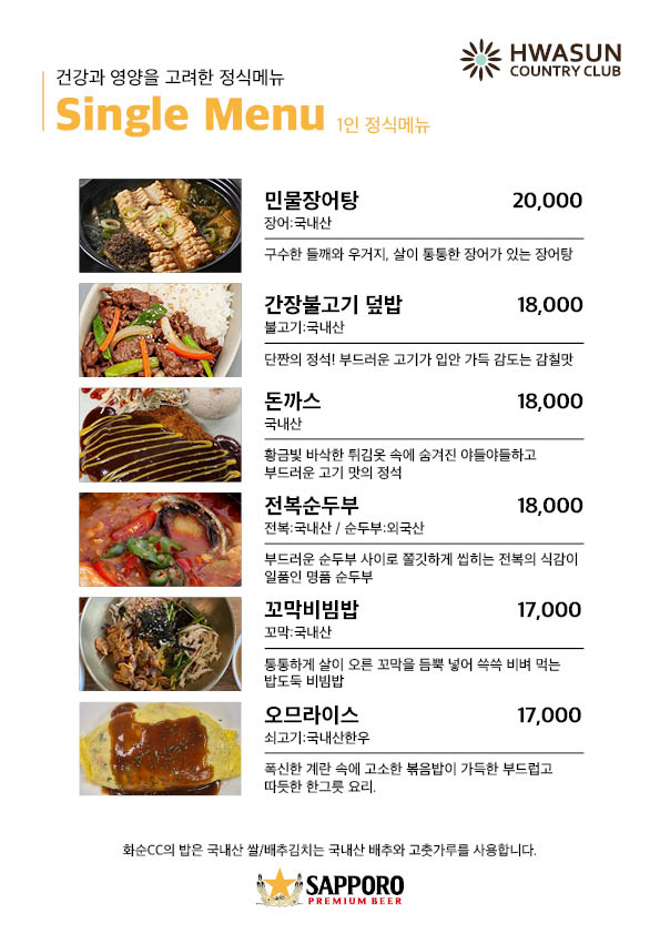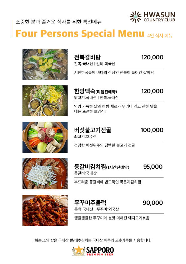 저희 화순컨트리클럽 영업팀 직원들은 품격있는 서비스와 친절함을 고객여러분의 만족을 추구하기 위해 최상의 서비스를 제공하고자 노력하고 있습니다. 한.중.일 양식의 최고의 요리사들로 구성된 주방요원들은 타사에서 볼 수 없는 정갈스럽고 그림같은 데코레이션과 지역토산품을 이용한 향토음식을 개발, 판매하고 있사오니 많은 이용 바랍니다.